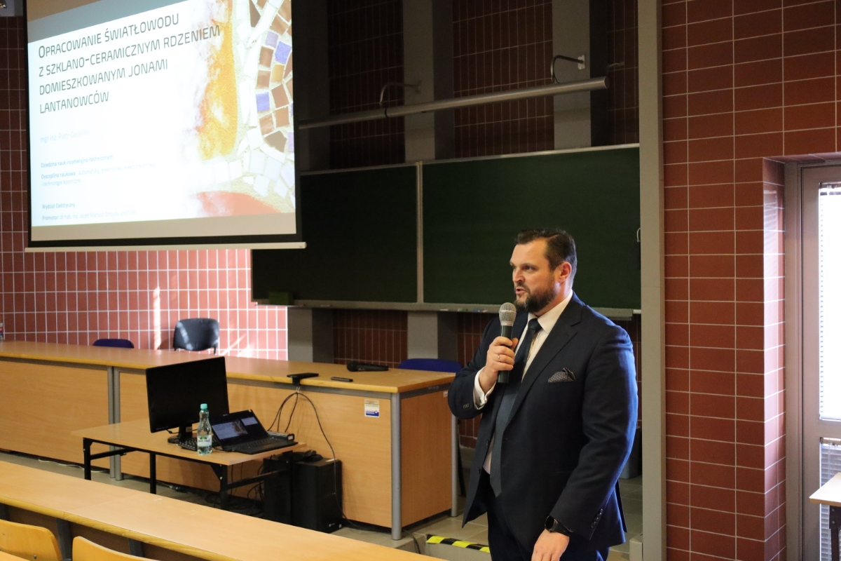 Postępowanie w sprawie nadania stopnia doktora mgr. inż. Piotra Golonko pt. „Opracowanie światłowodu z szklano-ceramicznym rdzeniem domieszkowanym jonami lantanowców” zostało wszczęte przez Radę Naukową Wydziału Elektrycznego Politechniki Białostockiej w dniu 18 października 2024 roku. Praca powstała pod opieką naukową dr hab. inż. Jacka Mariusza Żmojdy, prof. PB. Obronie rozprawy doktorskiej w dniu 09 kwietnia 2025 r. przewodniczył dr hab. inż. Maciej Zajkowski, prof. PB.