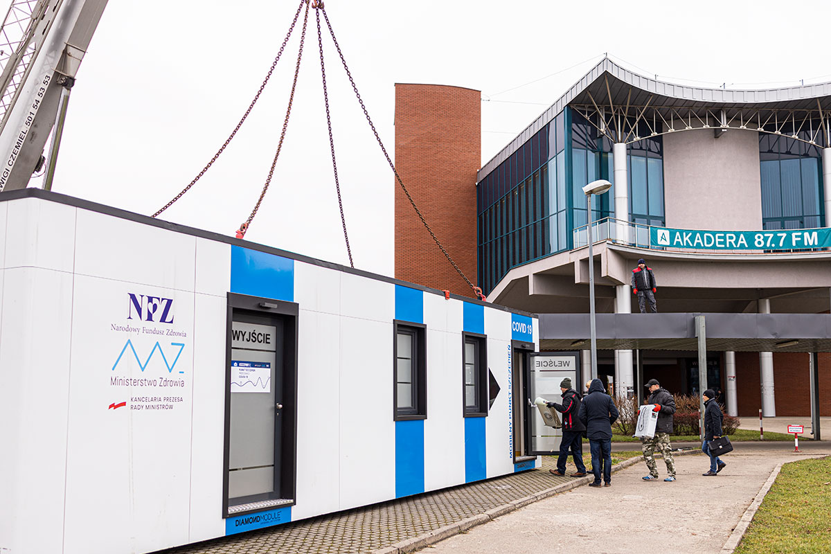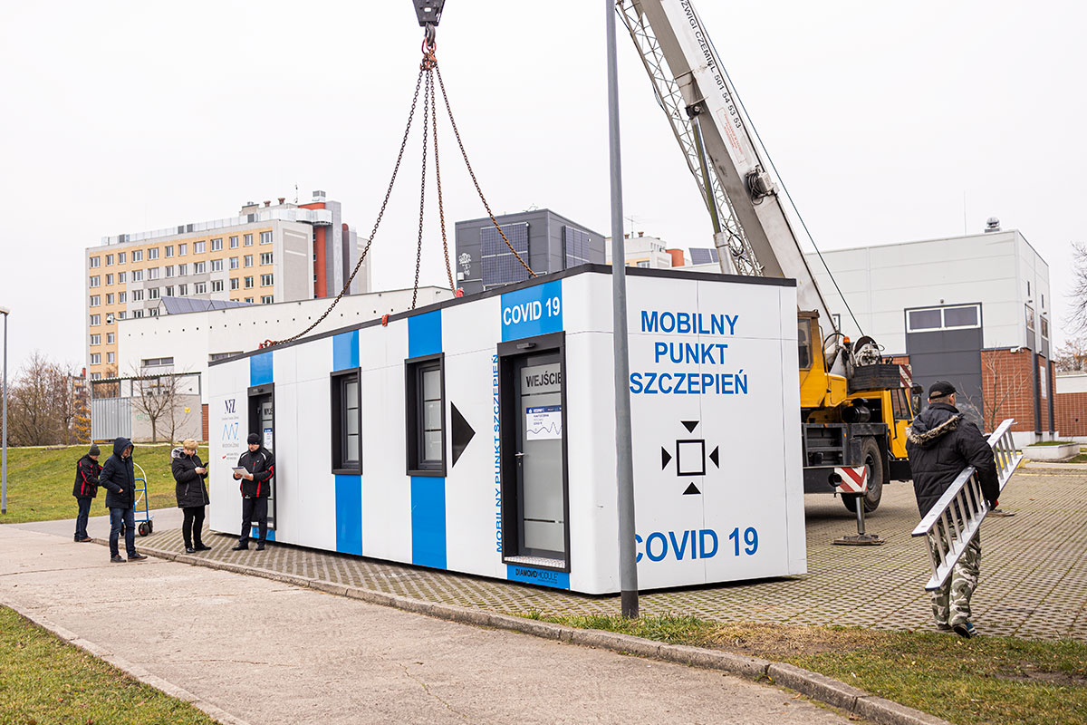 Kilka zdjęć z ustawiania kontenera Mobilnego Punktu Szczepień.